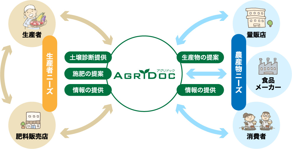 農業環境の負荷低減を目指した肥料と、付加価値の高い農産物生産に繋がる肥料の提供、そして生産された農産物の流通を担う等、AgriDocは、社会に貢献する企業です。